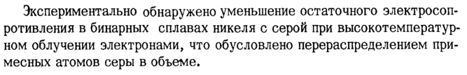 Экспериментально обнаружено уменьшение остаточного электросопротивления в бинарных сплавах никеля с серой при высокотемпературном облучении электронами, что обусловлено перераспределением примесных атомов серы в объеме.