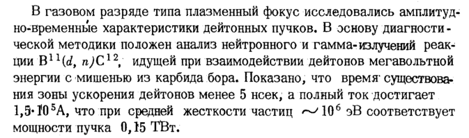 В газовом разряде типа плазменный фокус исследовались амплитудно-временные характеристики дейтонных пучков, В основу диагности -ческой методики положен анализ нейтронного и гамма-излучений реакции В1 l{d, п)С12, идущей при взаимодействии дейтонов мегавольтной энергии с мишенью из карбида бора. Показано, что время* существования зоны ускорения дейтонов менее 5 нсек, а полный ток достигает 1,5· 10 5А, что при средней жесткости частиц ^ 106 эВ соответствует мощности пучка 0,15 ТВт.