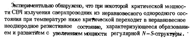 Экспериментально обнаружено, что при некоторой критической мощности СВЧ излучения сверхпроводник из неравновесного однородного состояния при температуре ниже критической переходит в неравновесное неоднородное резистивное состояние, характеризующееся образованием и развитием с увеличением мощности регулярной iV-S-структуры. "