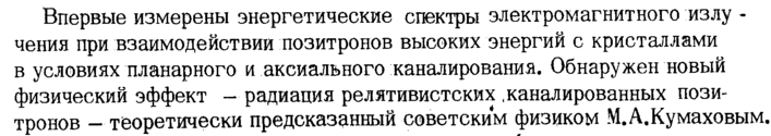 Впервые измерены энергетические спектры электромагнитного излу -чения при взаимодействий позитронов высоких энергий с кристаллами в условиях планарного и аксиального каналирования. Обнаружен новый физический эффект радиация релятивистских ,каналированных позитронов теоретически предсказанный советским физиком М.А.Кумаховым.