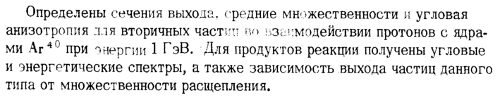 Определены сечения выхода, средние множественности и угловая анизотропия для вторичных частит по взаимодействии протонов с ядрами Аг40 при онергии 1 ГэВ. Для продуктов реакции получены угловые и энергетические спектры, а также зависимость выхода частиц данного типа от множественности расщепления.