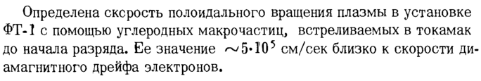Определена скорость полоидального вращения плазмы в установке ФТ-1 с помощью углеродных макрочастиц, встреливаемых в токамак до начала разряда. Ее значение ^5· 105 см/сек близко к скорости ди амагнитного дрейфа электронов.