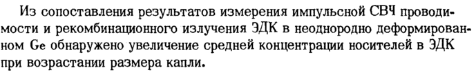 Из сопоставления результатов измерения импульсной СВЧ проводимости и рекомбинационного излучения ЭДК в неоднородно деформированном Ge обнаружено увеличение средней концентрации носителей в ЭДК при возрастании размера капли.