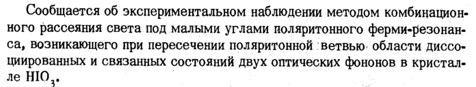 Сообщается об экспериментальном наблюдении методом комбинационного рассеяния света под малыми углами поляритонного ферми-резонан-са, возникающего при пересечении поляритонной ветвьюобласти диссоциированных и связанных состояний двух оптических фононов в кристалле НЮ,.