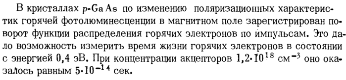 В кристаллах p-GaAs по изменению поляризационных характеристик горячей фотолюминесценции в магнитном поле зарегистрирован поворот функции распределения горячих электронов по импульсам. Это да-ло возможность измерить время жизни горячих электронов в состоянии с энергией 0,4 эВ. При концентрации акцепторов 1,2-1018 см"3 оно оказалось равным 5·10~14 сек.