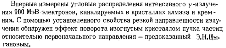 Впервые измерены угловые распределения интенсивного у-Излучения 900 МэВ электронов, каналируемых в кристаллах алмаза и кремния, С помощью установленного свойства резкой направленности излучения обнаружен эффект поворота изогнутым кристаллом пучка частиц относительно первоначального направления — предсказанный Э.Н.Цыгановым.