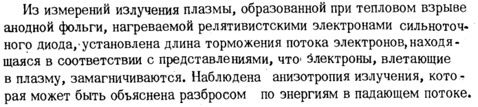 Из измерений излучения плазмы, образованной при тепловом взрыве анодной фольги, нагреваемой релятивистскими электронами сильноточного диода, установлена длина торможения потока электронов,находящаяся в соответствии с представлениями, что1 электроны, влетающие в плазму, замагничиваются. Наблюдена анизотропия излучения, которая может быть объяснена разбросом по энергиям в падающем потоке.
