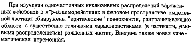 При изучении одночастичных инклюзивных распределений заряженных тг-^езонов в /г~р-ёзаимодействиях в фазовом пространстве выделенной частицы обнаружены "критические" поверхности, разграничивающие области с существенно отличными характеристиками (в частности, угловыми распределениями) рожденных частиц. Введена также новая кинематическая переменная.