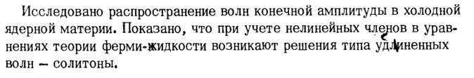 Исследовано распространение волн конечной амплитуды в холодной ядерной материи. Показано, что при учете нелинейных членов в уравнениях теории ферми-жидкости возникают решения типа удДртненных волн — солитоны.