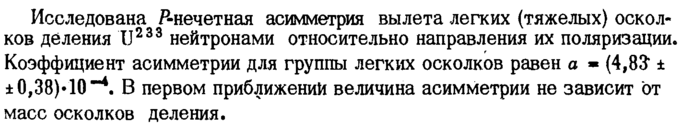 Исследована Р-нечетная асимметрия вылета легких (тяжелых) осколков деления и233 нейтронами относительно направления их поляризации. Коэффициент асимметрии для группы легких осколков равен а (4,83* ± ±0,38)·10~4. В первом приближении величина асимметрии не зависит "от масс осколков деления.