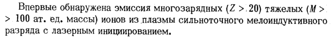 Впервые обнаружена эмиссия многозарядных (Z > 20) тяжелых (М > > 100 ат. ед. Массы) ионов изллазмы сильноточного мелоиндуктивного разряда с лазерным инициированием.