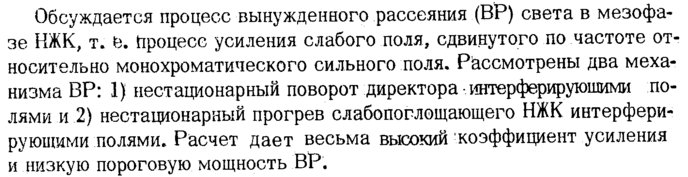 Обсуждается процесс вынужденного рассеяния (BP) света в мезофа-зе НЖК, т. fe. Цроцесе усиления слабого поля, сдвинутого по частоте относительно монохроматического сильного поля. Рассмотрены два механизма BP: 1) нестационарный поворот директора интерферирующими полями и 2) нестационарный прогрев слабопоглощающего НЖК интерферирующими полями. Расчет дает весьма высокий-коэффициент усиления и низкую пороговую мощность BP,