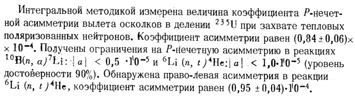 Интегральной методикой измерена величина коэффициента Р-нечет-ной асимметрии вылета осколков в делении 23 5U при захвате тепловых поляризованных нейтронов. Коэффициент асимметрии равен (0,84 ±0,06) х 10~4. Получены ограничения на Р-нечетную асимметрию в реакциях 10В(п, а)7Ы:-\а\ < 0,5 -1(0"5и 6U (п, *;4Не;|а| Χ 1,0-1{0"5 (уровень достоверности 90%). Обнаружена право-левая асимметрия в реакции 6Li (л, г/Не, коэффициент асимметрии равен (0,95 ±0,04)-1(0"4.