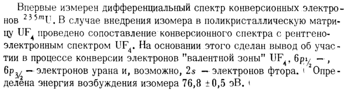Впервые измерен дифференциальный спектр конверсионных электронов 2 3 5mU. В случае внедрения изомера в поликристаллическую матрицу UF4 проведено сопоставление конверсионного спектра с рентгено-электронным спектром UF4. На основании этого сделан вывод об участии в процессе конверсии электронов "валентной зоны" UF4, бру —, бру — электронов урана и, возможно, 2s — электронов фтора, ι Определена энергия возбуждения изомера 76,8 ±0,5 э'В. t