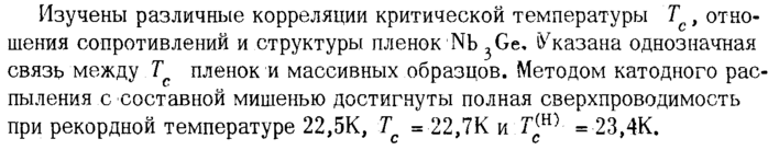 Изучены различные корреляции критической температуры Τ , отношения сопротивлений и структуры пленок Nb 3Ge. Указана однозначная связь между Τ пленок и массивных образцов. Методом катодного распыления с 'Составной мишенью достигнуты полная сверхпроводимость при рекордной температуре 22,5К, Τ = 22,7К и Т^н) = 23,4К.