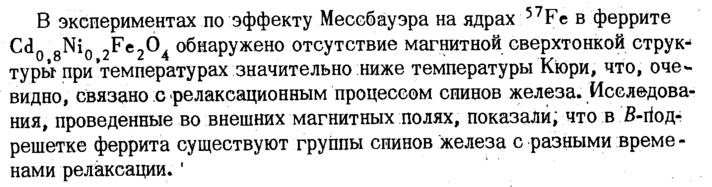 В экспериментах по эффекту Мессбауэра на ядрах 57Fc в феррите 8^0 2^е2^4 обнаружено отсутствие магнитной сверхтонкой струк-1 туры при'температурах значительно ниже температуры Кюри, что, очевидно, связано с релаксационным процессом спинов железа. Исследования, проведенные во внешних магнитных полях, показали, что в В-йод-решетке феррита существуют группы спинов железа с разными временами релаксации.1