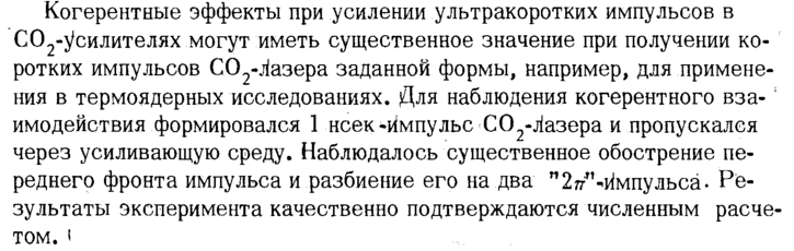 Когерентные эффекты при усилении ультракоротких импульсов в С02-усилителях могут иметь существенное значение при получении коротких импульсов C02-jia3epa заданной формы, например, для применения в термоядерных исследованиях. Для наблюдения когерентного вза-; имодействия формировался 1 нсек -Импульс С02-лазера и пропускался через усиливающую среду. Наблюдалось существенное обострение переднего фронта импульса и разбиение его на два "2тг"*ймпульсаРезультаты эксперимента качественно подтверждаются численным расчетом, ι