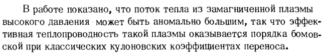 В работе показано, что поток тепла из замагниченной плазмы высокого давления может быть аномально большим, так что эффективная теплопроводность такой плазмы оказывается порядка бомов-ской при классических кулоновских коэффициентах переноса.