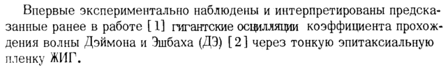 Впервые экспериментально наблюдены и интерпретированы предсказанные ранее в работе [ 1] гигантские осцилляции коэффициента прохождения волны Дэймона и Эшбаха (ДЭ) [2] через тонкую эпитаксиальную пленку ЖИГ.
