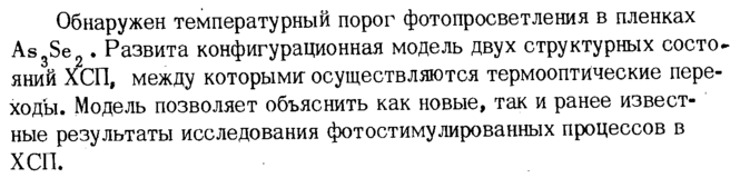 Обнаружен температурный порог фотопросветления в пленках As3Se2. Развита конфигурационная модель двух структурных состояний ХСП, между которымиосуществляются термооптические переходы. Модель позволяет объяснить как новые, так и ранее известные результаты исследования фотостимулированных процессов в ХСП.