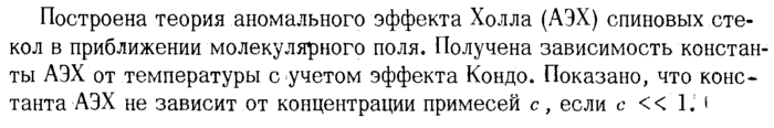 Построена теория аномального эффекта Холла (АЭХ) спиновых стекол в приближении молекулярного поля. Получена зависимость константы АЭХ от температуры с учетом эффекта Кондо. Показано, что константа АЭХ не зависит от концентрации примесей с, если с << 1J ι