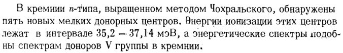 В кремнии гс-типа, выращенном методом Чохральского, обнаружены пять новых мелких донорных центров. Энергии ионизации этих центров лежат в интервале 35,2 — 37,14 мэВ, а энергетические спектры подобны спектрам доноров V группы в кремнии.
