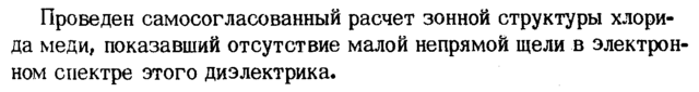 Проведен самосогласованный расчет зонной структуры хлорида меди, показавший отсутствие малой непрямой щели в электронном спектре этого диэлектрика.