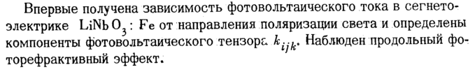 Впервые получена зависимость фотовольтаического тока в сегнето-электрике LiNb 03: Fe от направления поляризации света и определены компоненты фотовольтаического тензора к.-к. Наблюден продольный фо-торефрактивный эффект.