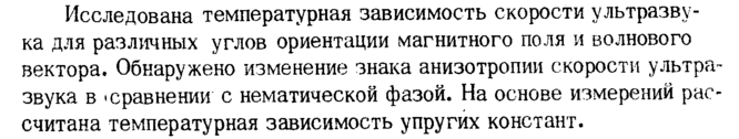 Исследована температурная зависимость скорости ультразвука для различных углов ориентации магнитного поля и волнового вектора. Обнаружено изменение знака анизотропии скорости ультразвука в » сравнении с нематической фазой. На основе измерений рассчитана температурная зависимость упругих констант.