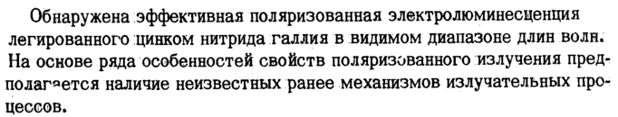 Обнаружена эффективная поляризованная электролюминесценция легированного цинком нитрида галлия в видимом диапазоне длин волн. На основе ряда особенностей свойств поляризованного излучения пред полагается наличие неизвестных ранее механизмов излучательных про цессов.
