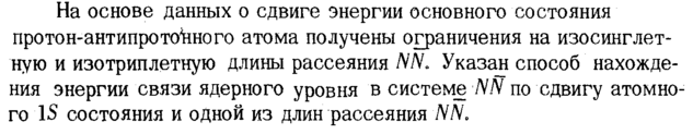 На основе данных о сдвиге энергии основного состояния протон-антипрото^нного атома получены ограничения на изосинглет-ную и изотриплетную длины рассеяния NN. Указа^ способ нахождения энергии связи ядерного уровня в системе 7V7V по сдвигу атомного IS состояния и одной из длин рассеяния 7V/V.