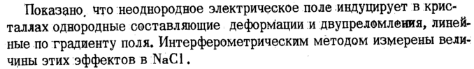 Показано, что неоднородное электрическое поле индуцирует в кристаллах однородные составляющие деформации и двупреломления, линейные по градиенту поля. Интерферометрическим методом измерены величины этих эффектов в NaCl.