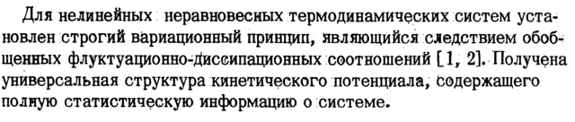 Для нелинейных: неравновесных термодинамических систем установлен строгий вариационный принцип, являющийся следствием обоб^ щенных флуктуационно-Диссипационных соотношений [1у 2]. Получена универсальная структура кинетического потенциала, Ьодержащего полную статистическую информацию о системе*