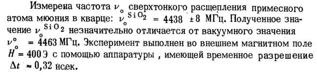 Измерена частота uQ сверхтонкого расщепления примесного атома мюония в кварце: ν Si02 = 4438 ±8 МГц. Полученное зна-чение vq 1 2 незначительно отличается от вакуумного значения v°q = 4463 МГц. Эксперимент выполнен во внешнем магнитном поле Η = 400Э с помощью аппаратуры ; имеющей временное разрешение Δί * 0,32 щек.