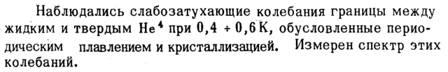 Наблюдались слабозатухающие колебания границы между жидким и твердым Не4 при 0,4 + 0,6К, обусловленные периодическим плавлением и кристаллизацией. Измерен спектр этих колебаний.