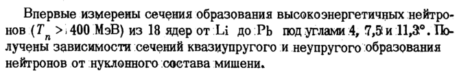 Впервые измерены сечения образования высоко энергетичяых нейтронов (Тп > i 400 МэВ) из 18 ядер от Li до :РЬ год углами 4, 7,5 и . Получены зависимости сечений квазиупругого и неупругого образования нейтронов от нуклонного состава мишени*