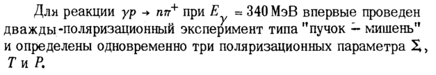 Для реакции γρ -+ ηπ*~ при = 340 МэВ впервые проведен дважды-поляризационный эксперимент типа "пучок — мишень" и определены одновременно три поляризационных параметра X , Г и Р.