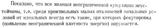 Показано, что все явления неограниченной кумуляции неустойчивы, т.е. среди произвольных малых отклонений начальных условий от идеальных всегда есть такие, при которых фокусировка (появление неограниченной плотности энергии.) нарушается.