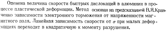 Оценена величина скорости быстрых дислокаций в алюминии в процессе пластической деформации. Метод основан на предсказанной В.Я.Кравченко зависимости электронного торможения от напряженности магнитного поля. Линейная зависимость скорости от σ при малых деформациях переходит в квадратичную к моменту разрушения.
