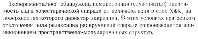 Экспериментально обнаружена немонотонная (ступенчатая) завили■ мость шага холестерической. спирали от величины поля в слое ХЖК, на поверхностях которого директор закреплен. В этих условиях при резком отключении поля релаксация раскрученной спирали сопровождается возникновением пространственно-модулированных структур.