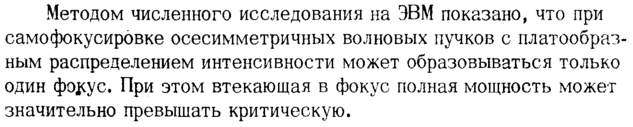 Методом численного исследования на ЭВМ показано, что при самофокусировке осесимметричных волновых пучков с платообраз-ным распределением интенсивности может образовываться только один фо^ус* При этом втекающая в фокус полная мощность может значительно превышать критическую.