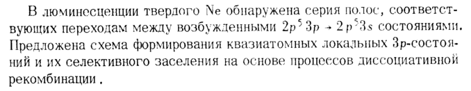 В люминесценции твердого Ne обнаружена серия полос, соответствующих переходам между возбужденными 2р53р -» 2p53s состояниями. Предложена схема формирования квазиатомных локальных Зр-состоя-ний и их селективного заселения на основе процессов диссоциативной рекомбинации,