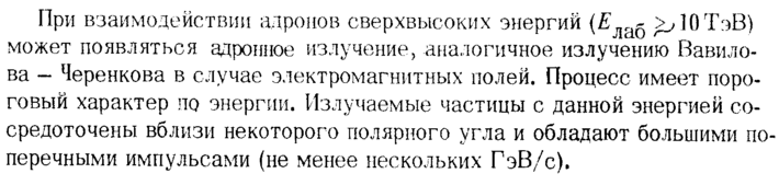 При взаимодействии адронов сверхвысоких энергий (£ла5 >Л0ТэВ) может появляться адронное излучение, аналогичное излучению Вавилова Черенкова в случае электромагнитных полей. Процесс имеет пороговый характер по энергии. Излучаемые частицы с данной энергией сосредоточены вблизи некоторого полярного угла и обладают большими поперечными импульсами (не менее нескольких ГэВ/с).