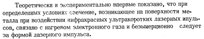 Теоретически и экспериментально впервые показано, что при определенных условиях свечение, возникающее на поверхности металла при воздействии инфракрасных ультракоротких лазерных ипуль-сов, связано с нагревом электронного газа и безынерционно следует за формой лазерного импульса.