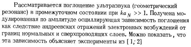 Рассматривается поглощение ультразвука (геометрический резонанс) в промежуточном состоянии при ка N » 1. Получена модулированная по амплитуде осциллирующая зависимость поглощения как следствие андреевских отражений электронных возбуждений от границ нормальных и сверхпроводящих слоев. Можно показать, что эта зависимость объясняет эксперименты из [ 1; 2]