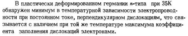 В пластически деформированном германии л-типа при 35К обнаружен минимум в температурной зависимости электропроводности при постоянном токе, перпендикулярном дислокациям, что свя зывается с наличием при той же температуре максимума коэффициента заполнения дислокаций электронами.