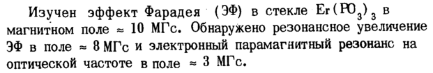 Изучен эффект Фарадея (ЭФ) в стекле Ег(Р03)3 в магнитном поле « 10 МГс. Обнаружено резонансное увеличение ЭФ в поле « 8 МГс и электронный парамагнитный резонанс на оптической частоте в поле « 3 МГс,
