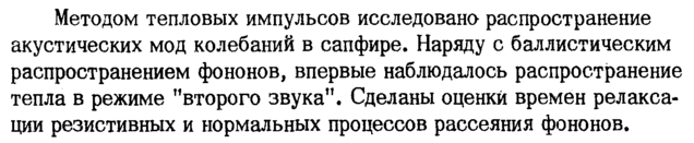 Методом тепловых импульсов исследовано распространение акустических мод колебаний в сапфире. Наряду с баллистическим распространением фононов, впервые наблюдалось распространение тепла в режиме "второго звука". Сделаны оценки времен релаксации резистивных и нормальных процессов рассеяния фононов.