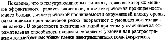 Показано, что в полупроводниковых пленках, толщина которых меньше эффзктивного радиуса экситонов, а диэлектрическая проницаемость много больше диэлектрической проницаемости окружающей пленку среды, силы осцилляторов экситонов резко возрастают с уменьшением толщины пленки. В окрестности экситонных линий при этом увеличивается отражательная способность пленки и создаются условия для распространения локализованных вблизи пленки электромагнитных волн-поляритогов.