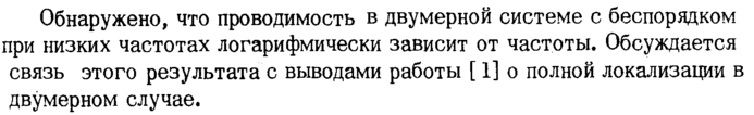Обнаружено, что проводимость в двумерной системе с беспорядком при низких частотах логарифмически зависит от частоты. Обсуждается связь этого результата с выводами работы [ 1] о полной локализации в двумерном случае.